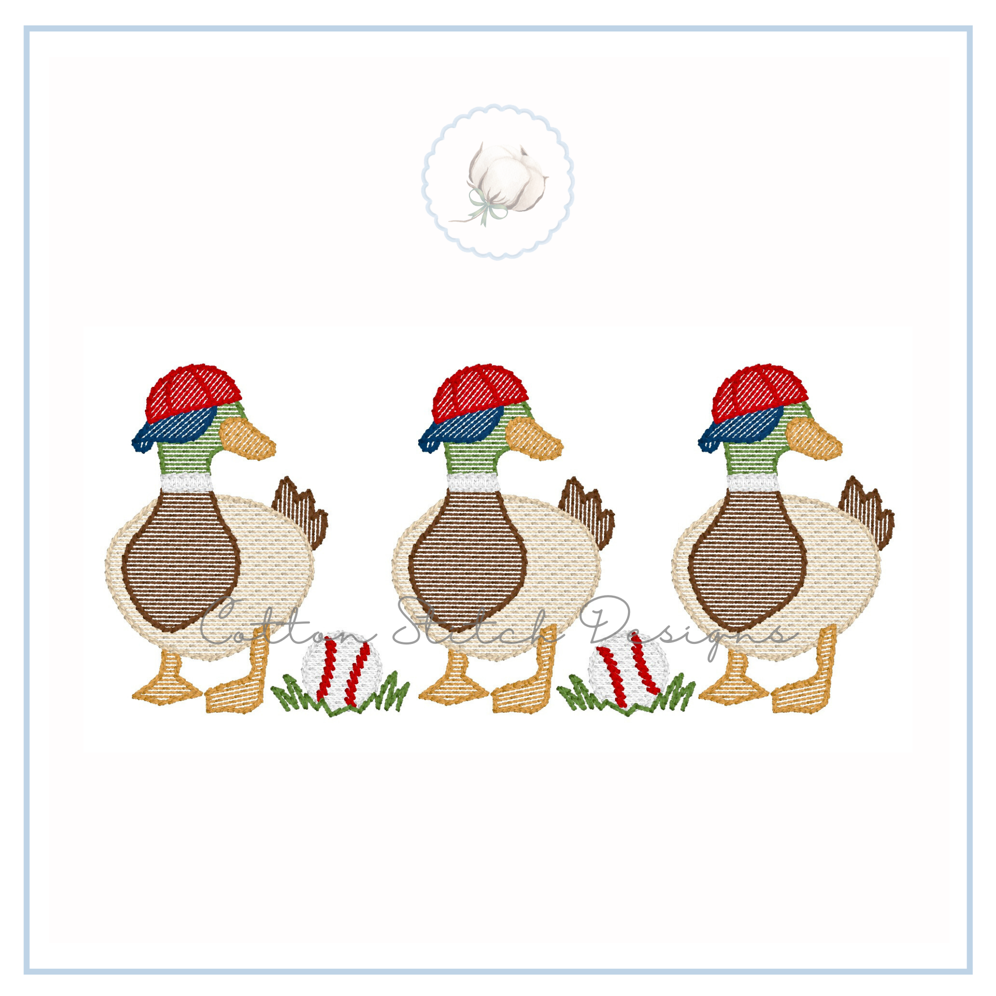Baseball Mallard Trio Design is a sketch stitch machine embroidery design, designed to have a lower stitch count and a lighter fill than a traditional fill stitch, allowing fabric to show through for a sketch appearance.