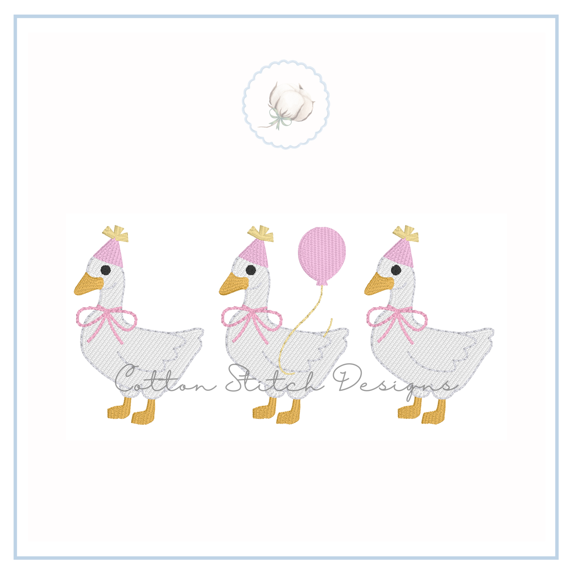 Birthday Goose Trio is a fill stitch machine embroidery design. This is a DIGITAL machine embroidery design available for immediate download. In order to use this file, you will need an embroidery machine and the means to unzip and transfer files. This is not a patch or finished product.