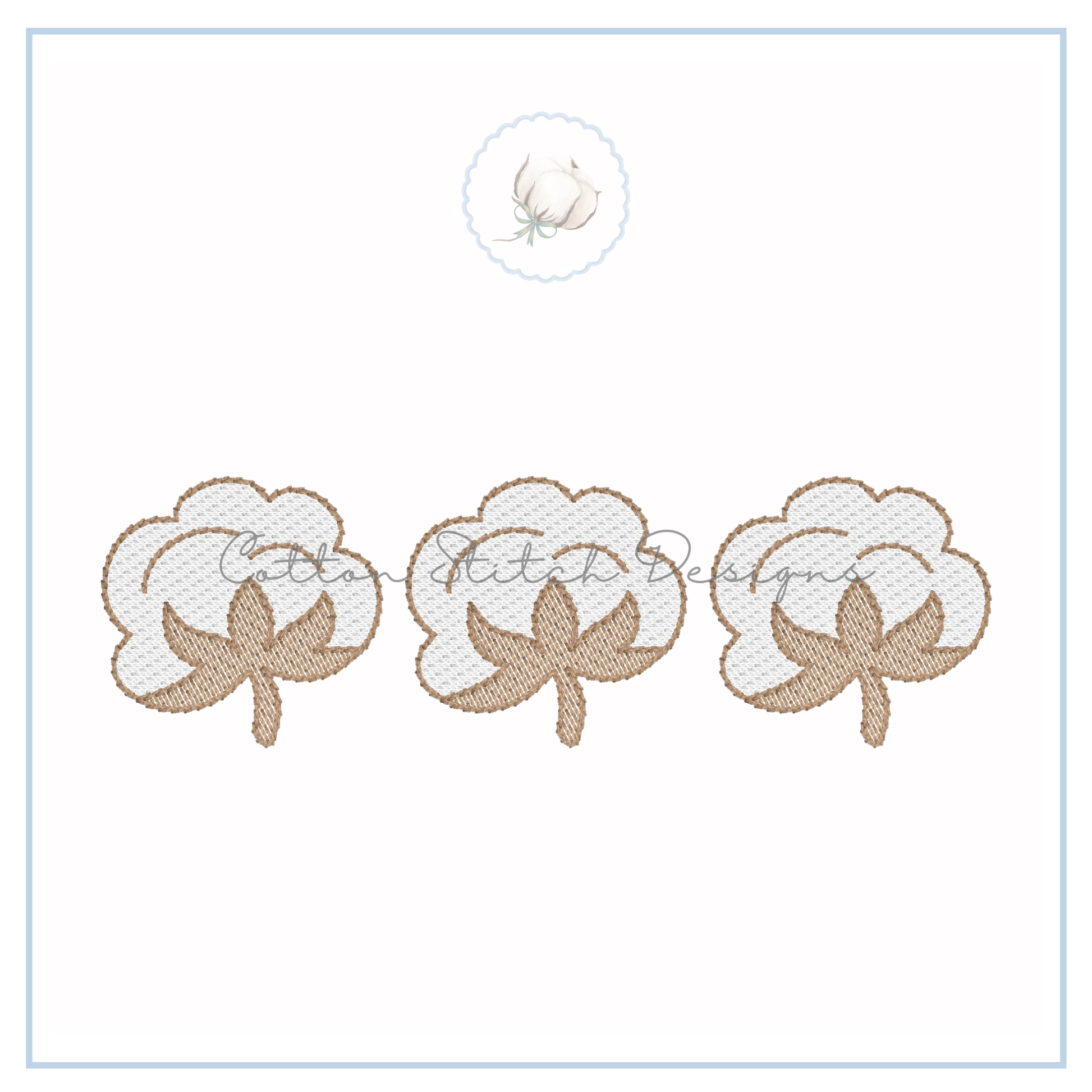 Cotton Trio Design is a sketch stitch machine embroidery design, designed to have a lower stitch count and a lighter fill than a traditional fill stitch, allowing fabric to show through for a sketch appearance.
