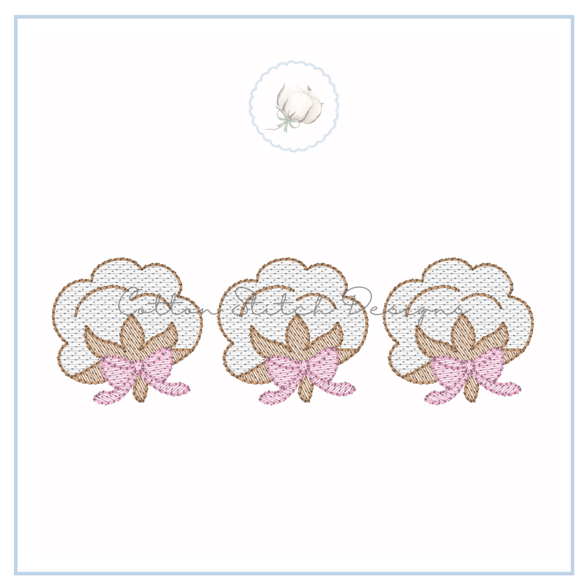 Cotton with Bows Trio Design is a sketch stitch machine embroidery design, designed to have a lower stitch count and a lighter fill than a traditional fill stitch, allowing fabric to show through for a sketch appearance.