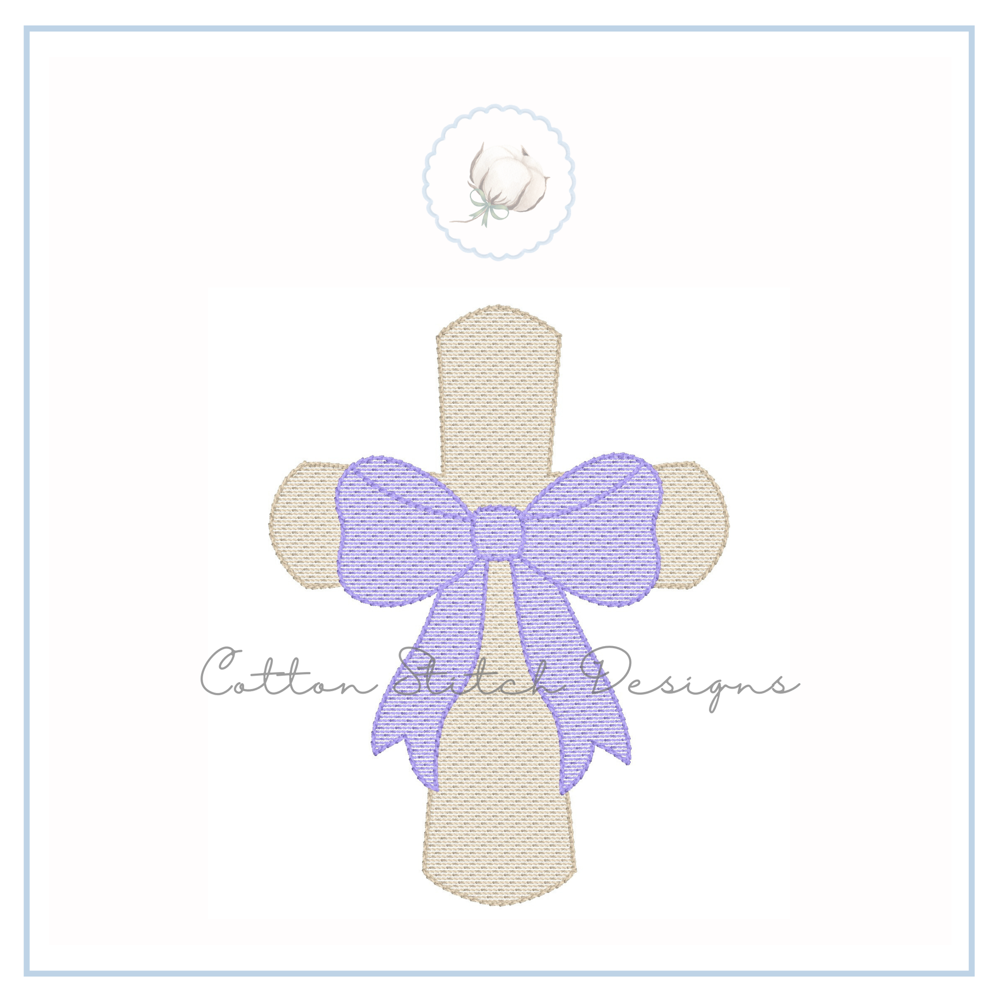 Cross with Bow is a sketch stitch machine embroidery design, designed to have a lower stitch count and a lighter fill than a traditional fill stitch, allowing fabric to show through for a sketch appearance.