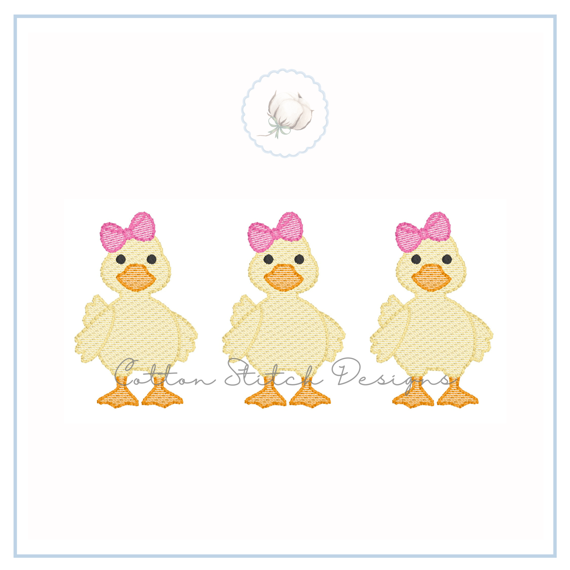 Cute Yellow Duck Bow Trio Design is a sketch stitch machine embroidery design, designed to have a lower stitch count and a lighter fill than a traditional fill stitch, allowing fabric to show through for a sketch appearance.