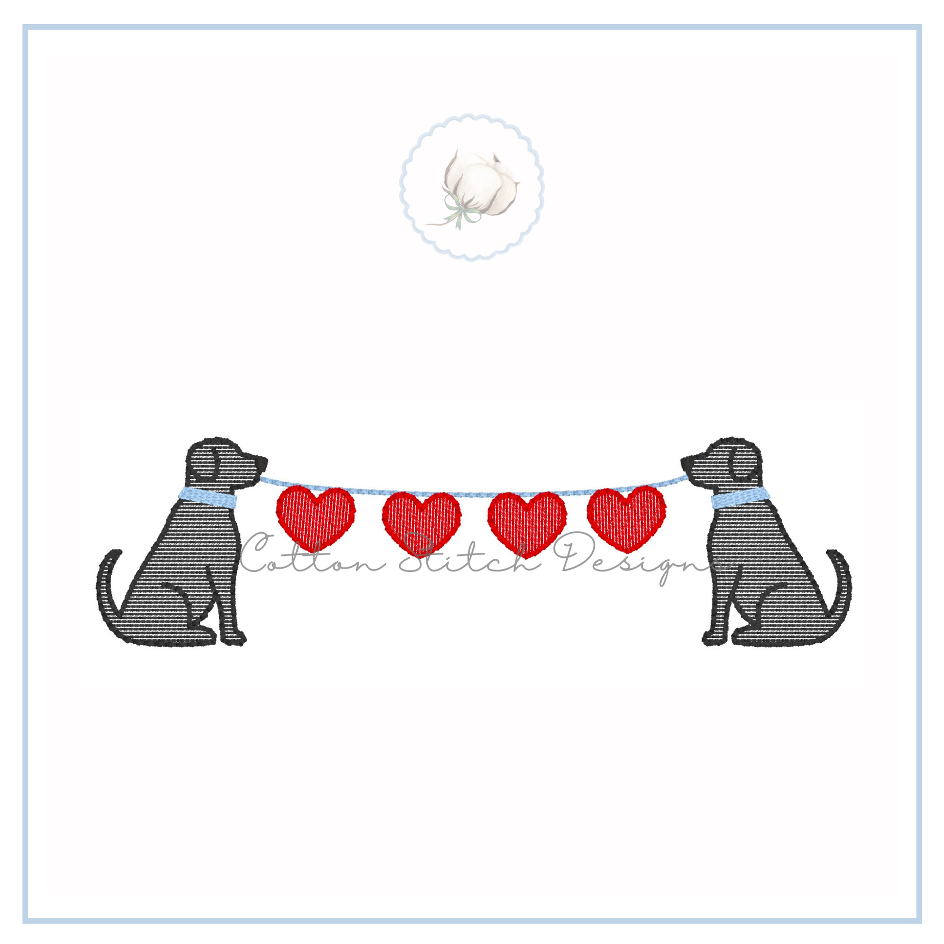 Dogs with Heart String Design is a sketch stitch machine embroidery design, designed to have a lower stitch count and a lighter fill than a traditional fill stitch, allowing fabric to show through for a sketch appearance.
