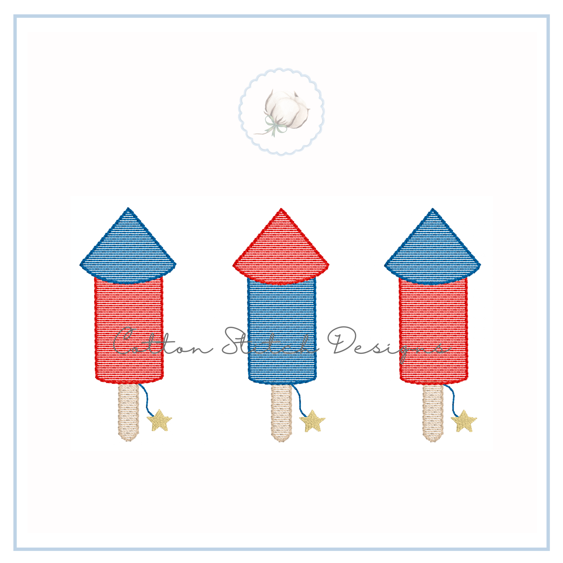 Firework Trio Design is a sketch stitch machine embroidery design, designed to have a lower stitch count and a lighter fill than a traditional fill stitch, allowing fabric to show through for a sketch appearance.