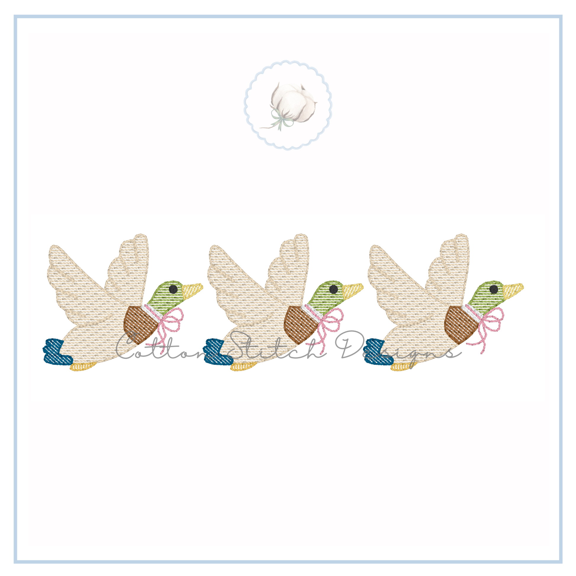 Flying Mallard Duck Bow Trio Design is a sketch stitch machine embroidery design, designed to have a lower stitch count and a lighter fill than a traditional fill stitch, allowing fabric to show through for a sketch appearance.