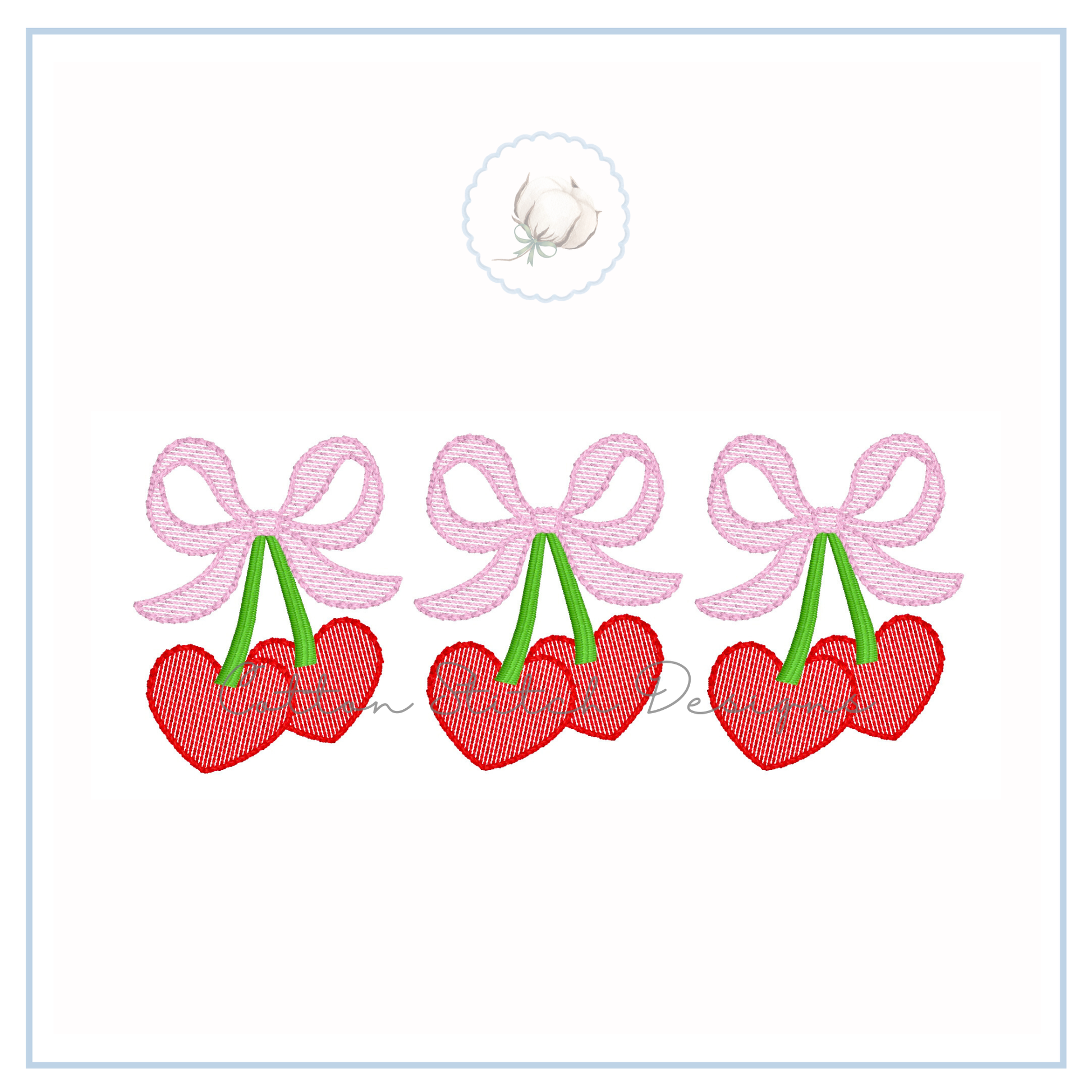Heart Cherry Bow Trio Design is a sketch stitch machine embroidery design, designed to have a lower stitch count and a lighter fill than a traditional fill stitch, allowing fabric to show through for a sketch appearance.