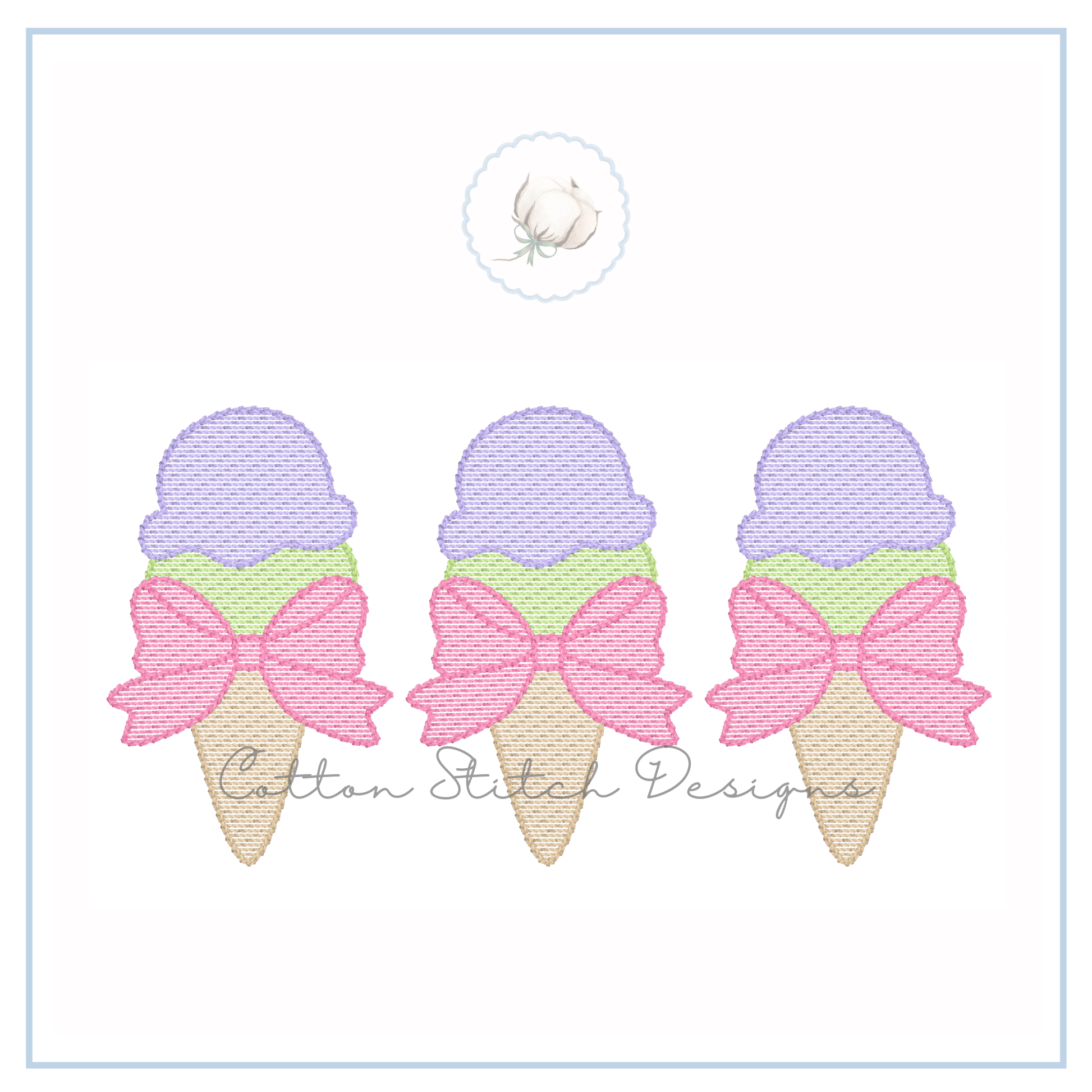 Ice Cream Bow Trio Embroidery Design is a sketch stitch machine embroidery design. Designed to have a lower stitch count and a lighter fill than a traditional fill stitch, allowing fabric to show through for a sketch appearance.