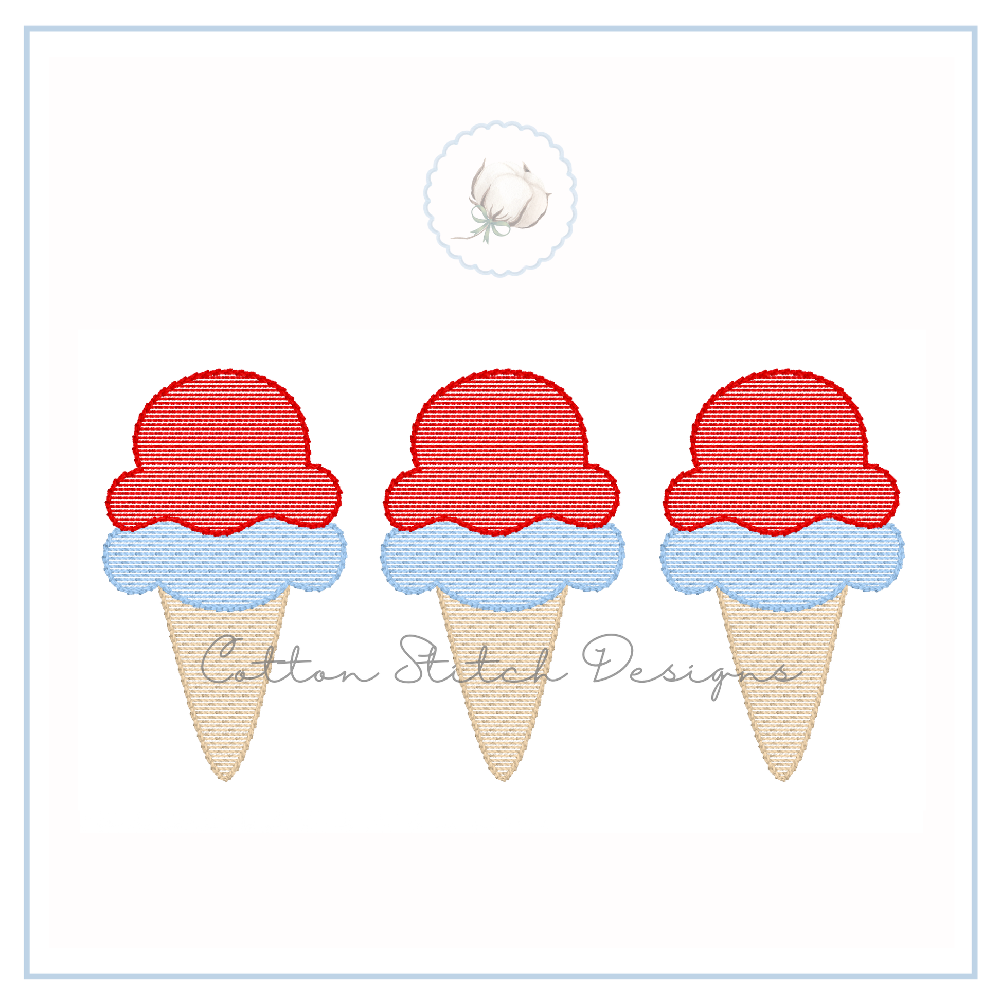 Ice Cream Trio Embroidery Design is a sketch stitch machine embroidery design. Designed to have a lower stitch count and a lighter fill than a traditional fill stitch, allowing fabric to show through for a sketch appearance.