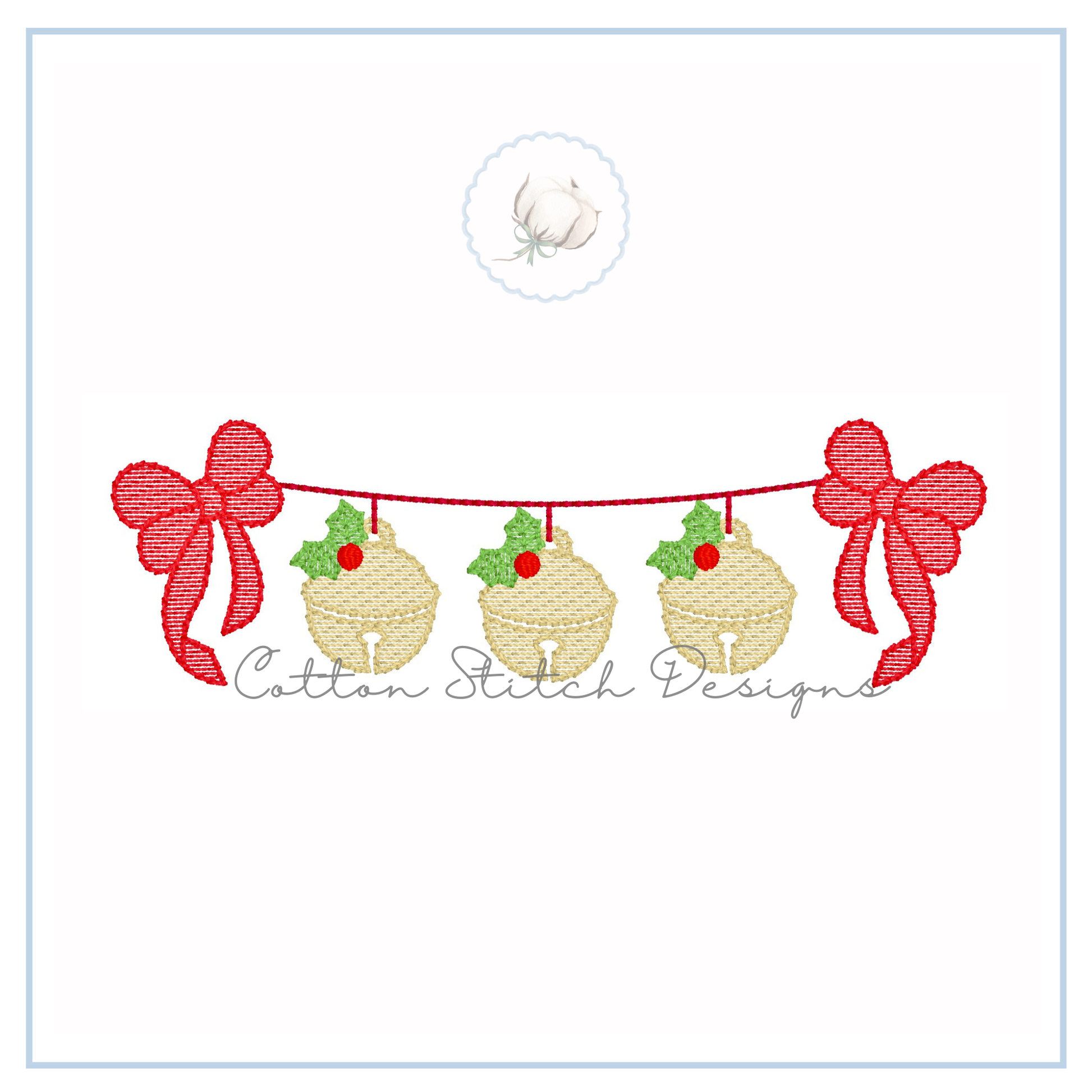 Jingle Bell Bow Swag Sketch Embroidery Design is a sketch stitch machine embroidery design. Designed to have a lower stitch count and a lighter fill than a traditional fill stitch, allowing fabric to show through for a sketch appearance.