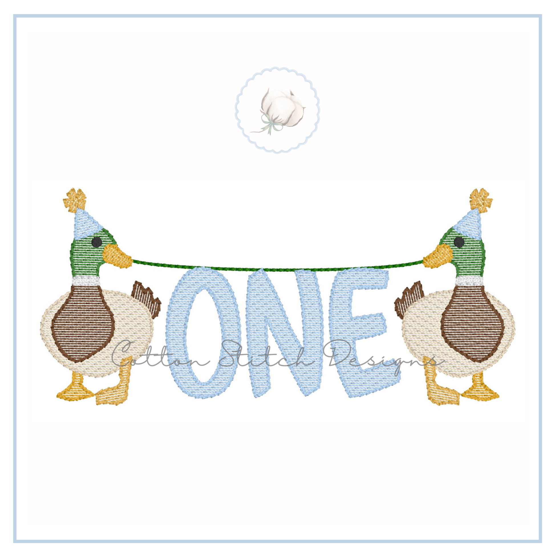 Mallards Holding One Birthday is a sketch stitch machine embroidery design, designed to have a lower stitch count and a lighter fill than a traditional fill stitch, allowing fabric to show through for a sketch appearance.