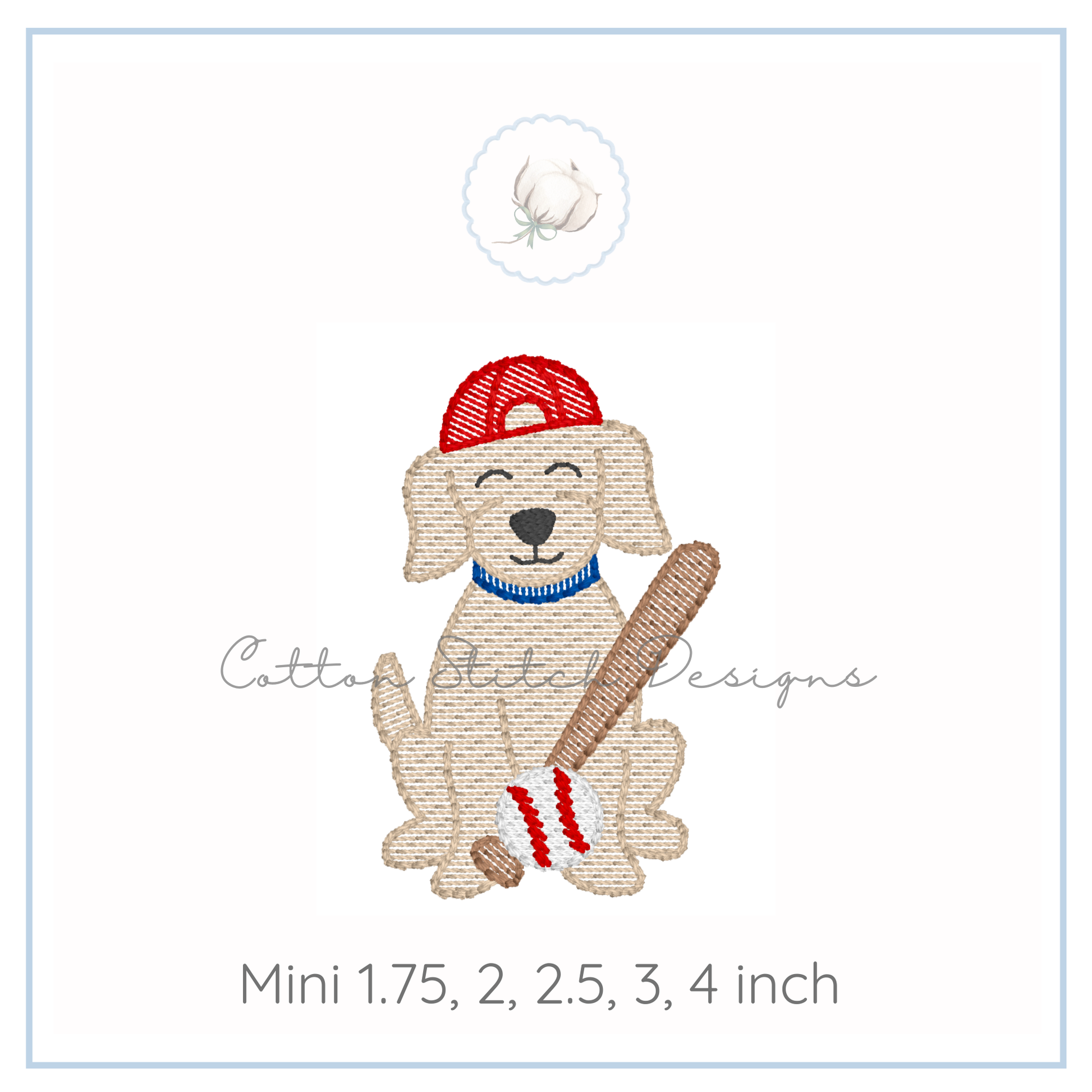 Mini Baseball Puppy Design is a sketch stitch machine embroidery design, designed to have a lower stitch count and a lighter fill than a traditional fill stitch, allowing fabric to show through for a sketch appearance.
