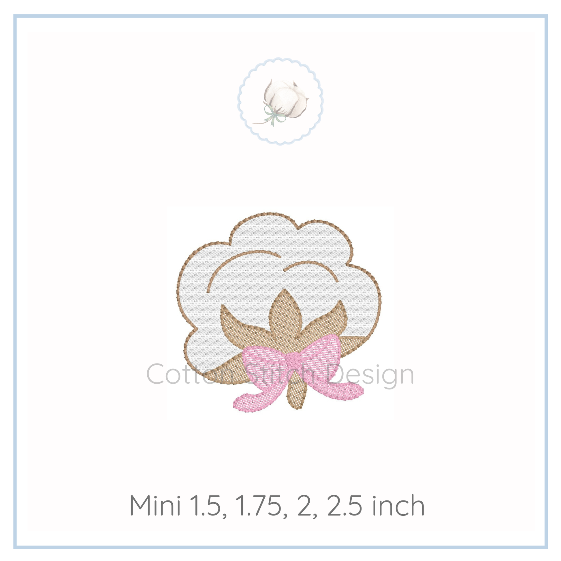 Mini Cotton Boll with Bow Design is a sketch stitch machine embroidery design, designed to have a lower stitch count and a lighter fill than a traditional fill stitch, allowing fabric to show through for a sketch appearance.