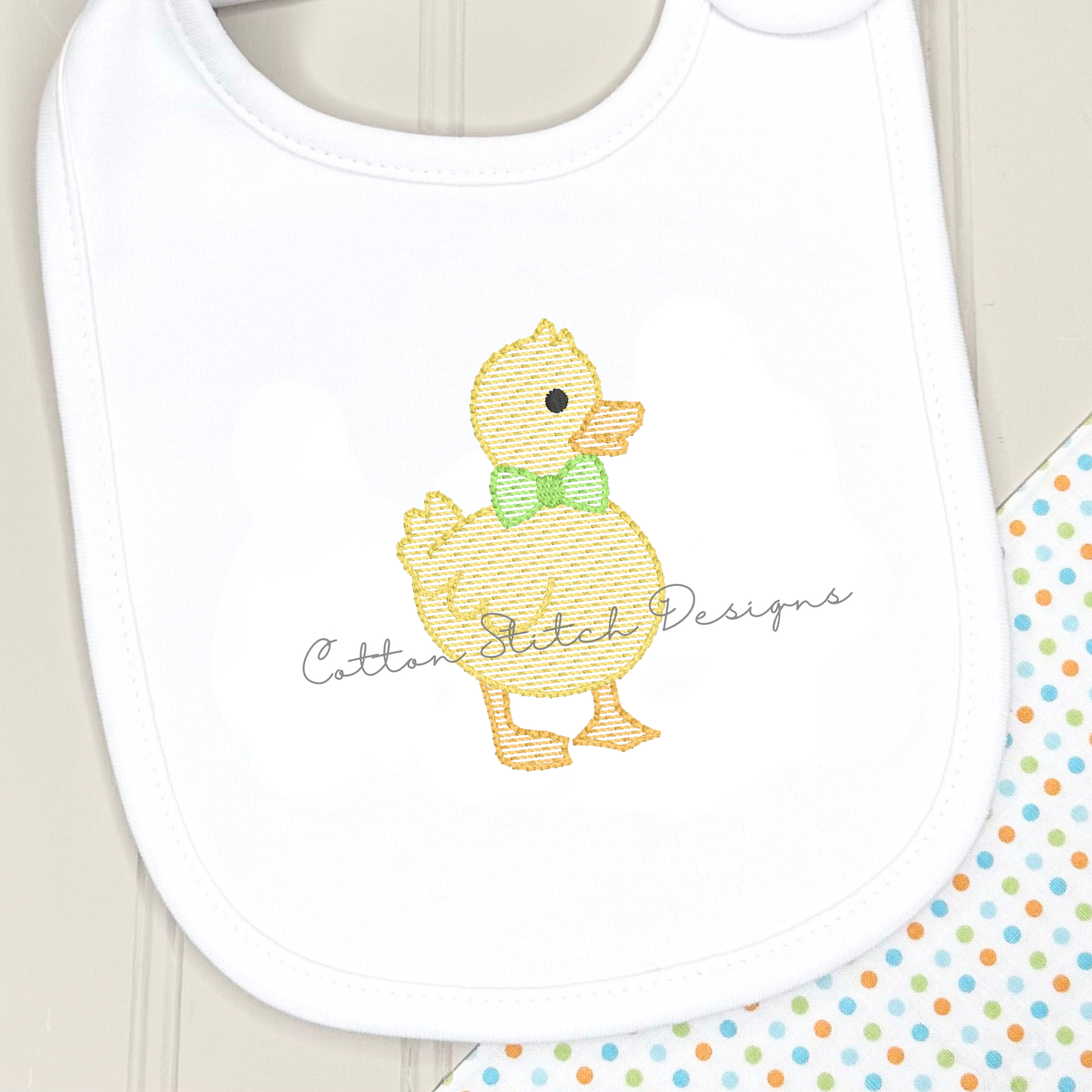 Mini Duckling Bow Tie Design is a sketch stitch machine embroidery design, designed to have a lower stitch count and a lighter fill than a traditional fill stitch, allowing fabric to show through for a sketch appearance.