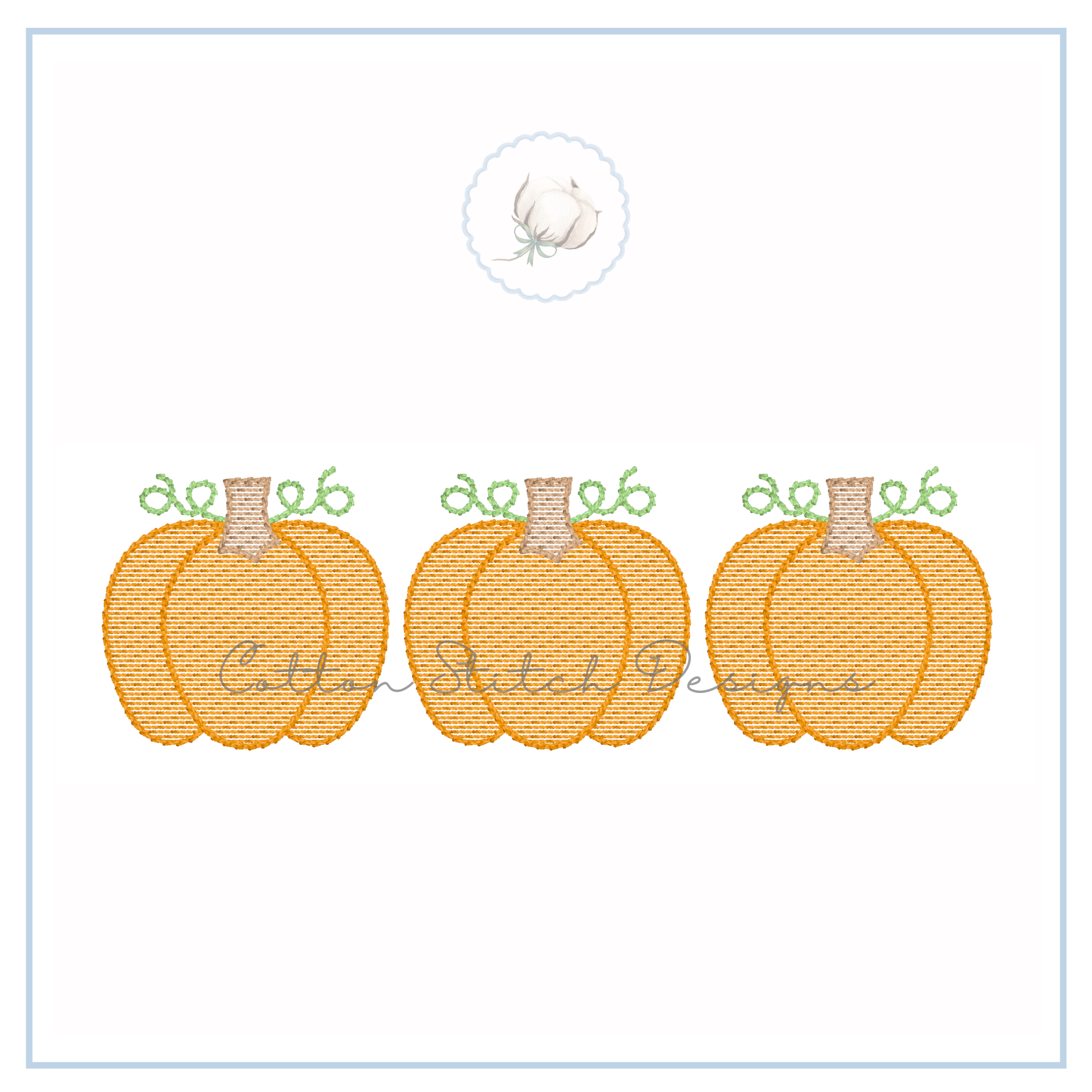 Pumpkin Trio Embroidery Design is a sketch stitch machine embroidery design. Designed to have a lower stitch count and a lighter fill than a traditional fill stitch, allowing fabric to show through for a sketch appearance.