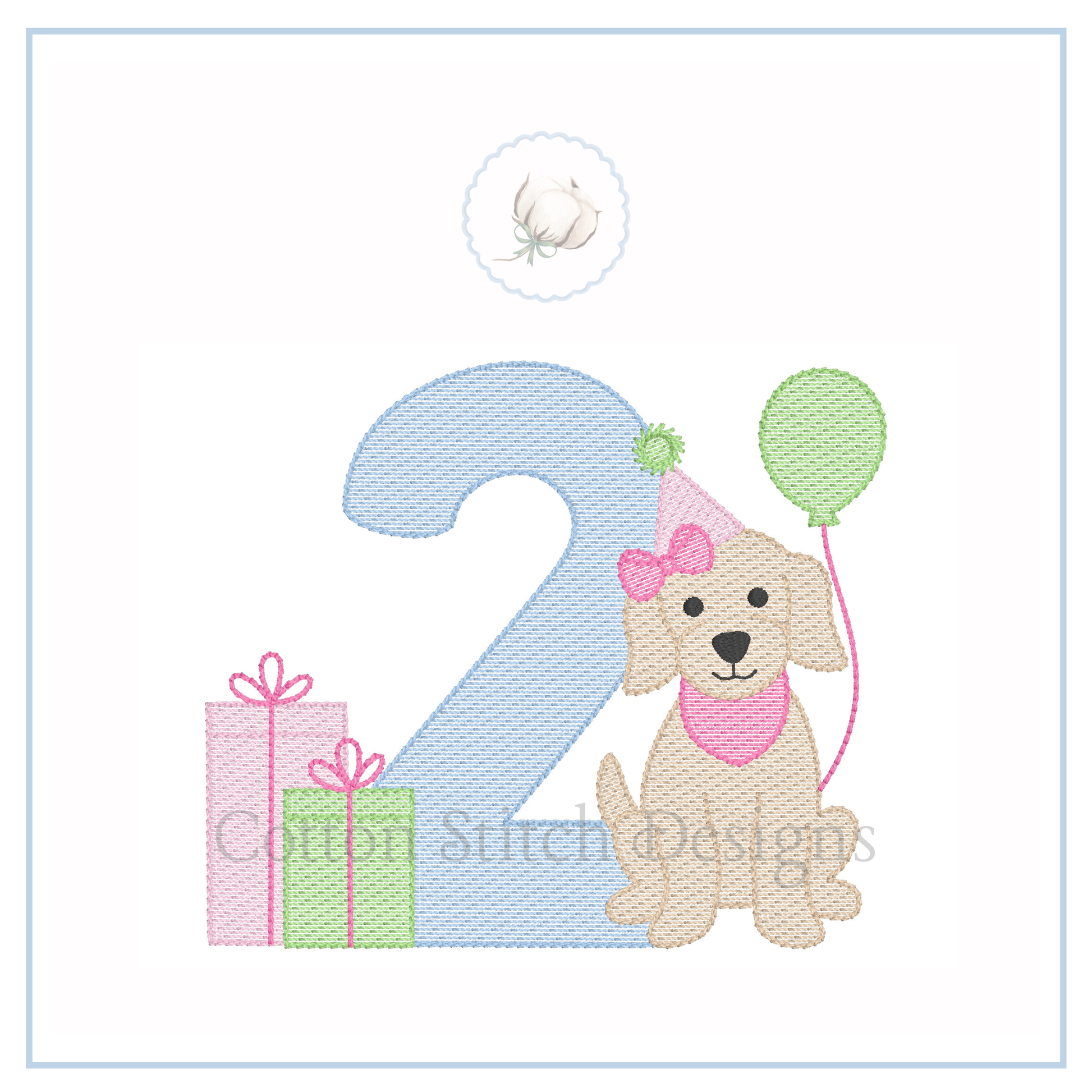Puppy Girl Birthday Number Two Design is a sketch stitch machine embroidery design, designed to have a lower stitch count and a lighter fill than a traditional fill stitch, allowing fabric to show through for a sketch appearance.