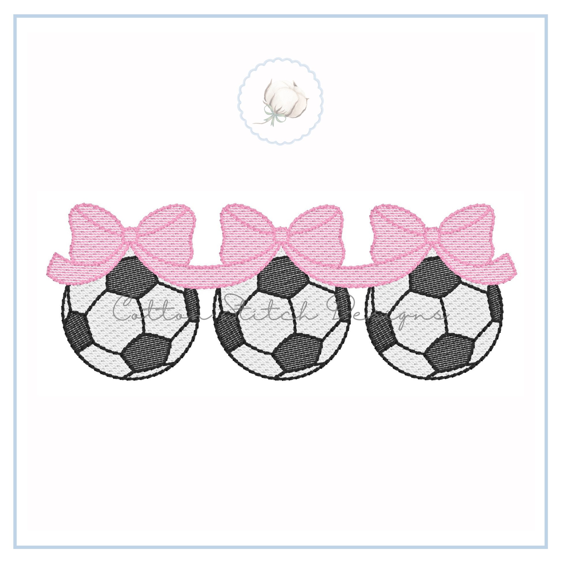 Soccer Ball Trio with Bows Design is a sketch stitch machine embroidery design, designed to have a lower stitch count and a lighter fill than a traditional fill stitch, allowing fabric to show through for a sketch appearance.