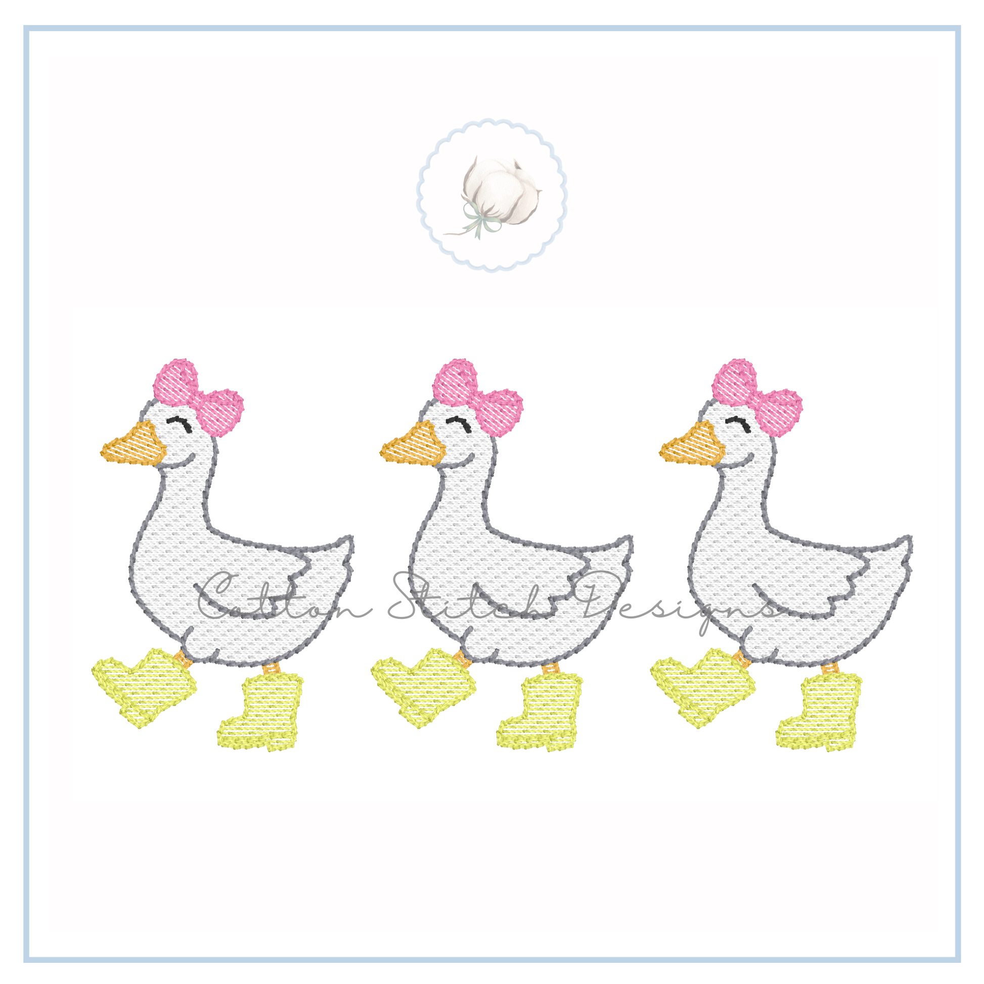 Spring Goose Bow Trio Design is a sketch stitch machine embroidery design, designed to have a lower stitch count and a lighter fill than a traditional fill stitch, allowing fabric to show through for a sketch appearance.