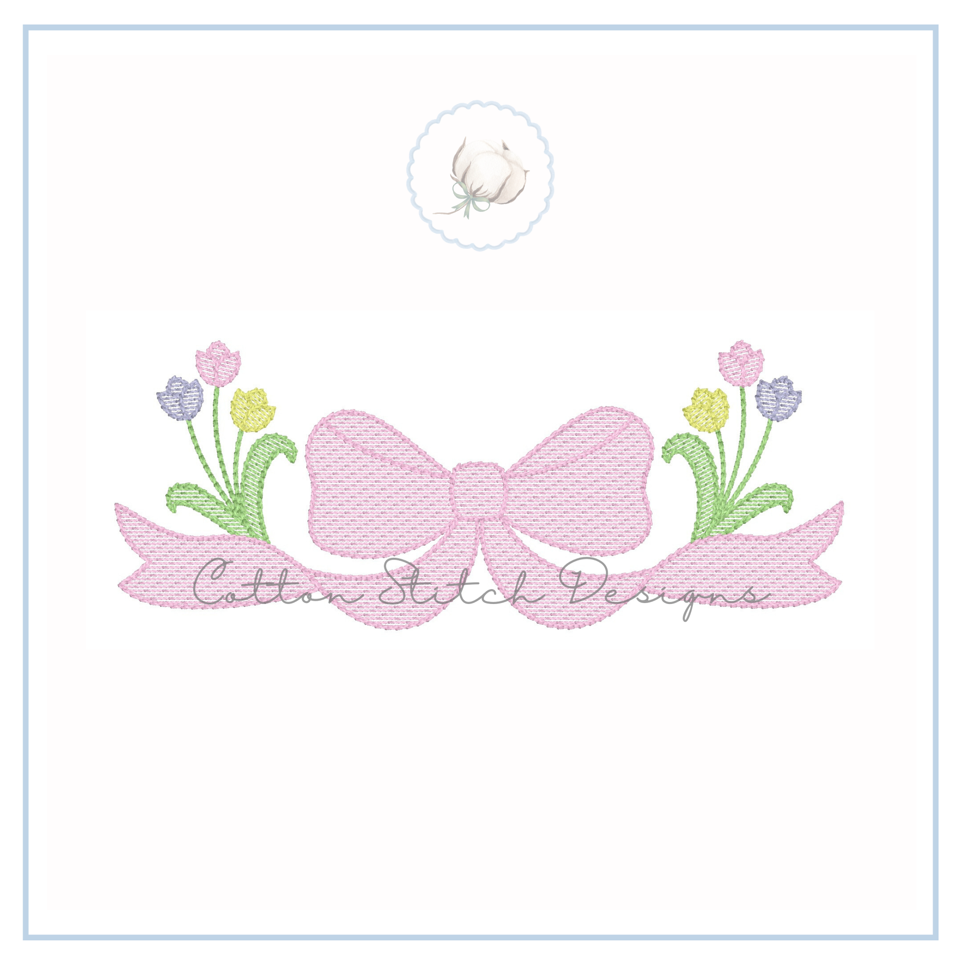 Spring Tulip Bow Design is a sketch stitch machine embroidery design, designed to have a lower stitch count and a lighter fill than a traditional fill stitch, allowing fabric to show through for a sketch appearance.