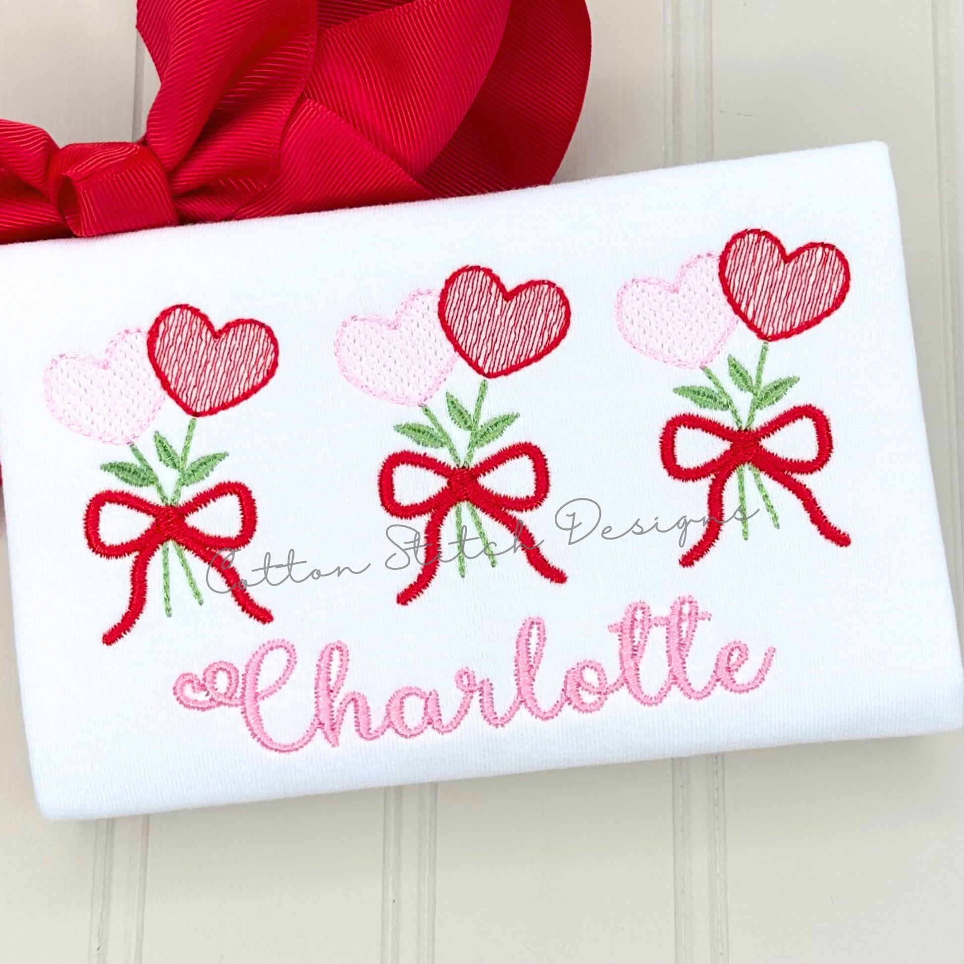 Valentine Heart Flower Trio Design is a sketch stitch machine embroidery design, designed to have a lower stitch count and a lighter fill than a traditional fill stitch, allowing fabric to show through for a sketch appearance.