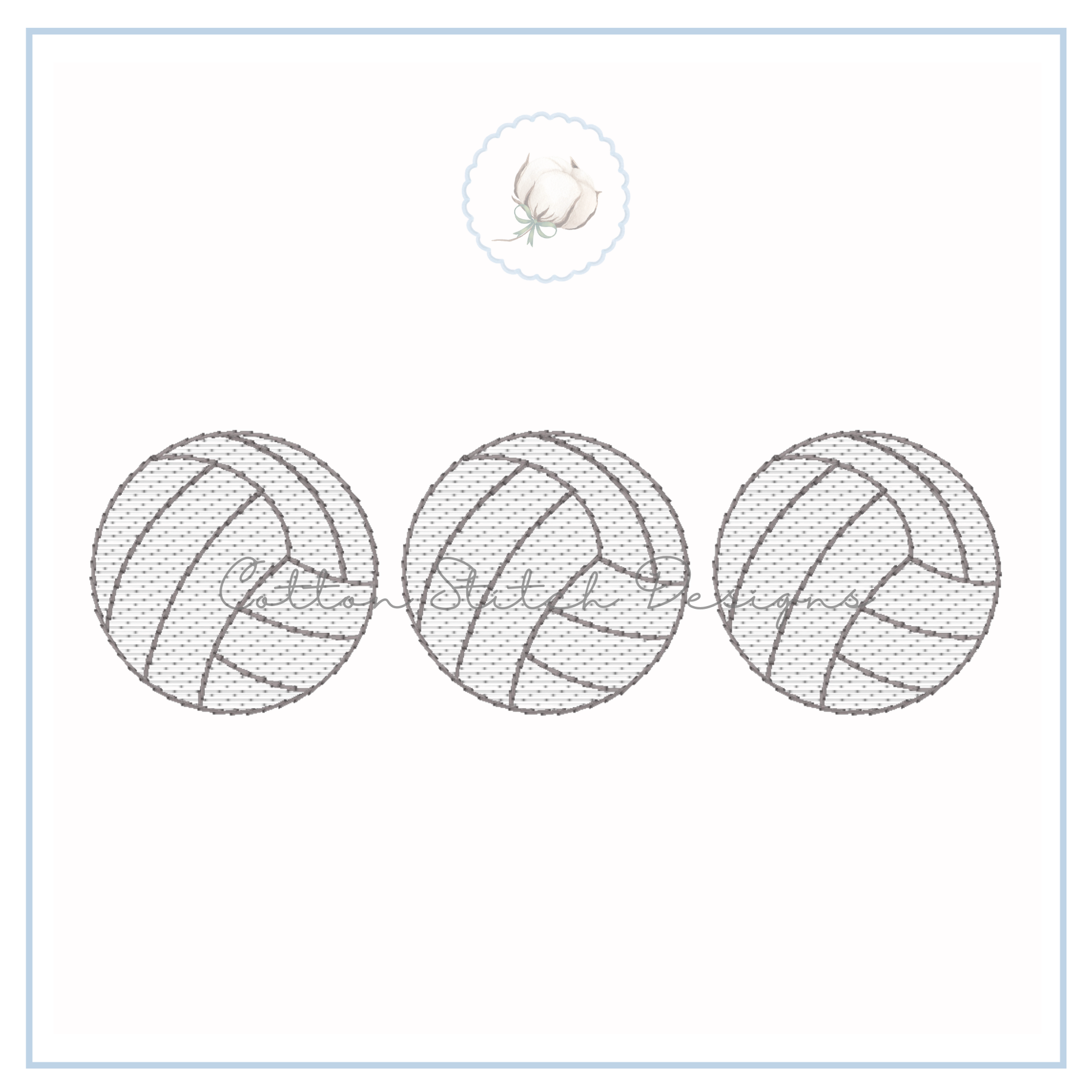 Volleyball Trio Design is a sketch stitch machine embroidery design, designed to have a lower stitch count and a lighter fill than a traditional fill stitch, allowing fabric to show through for a sketch appearance.