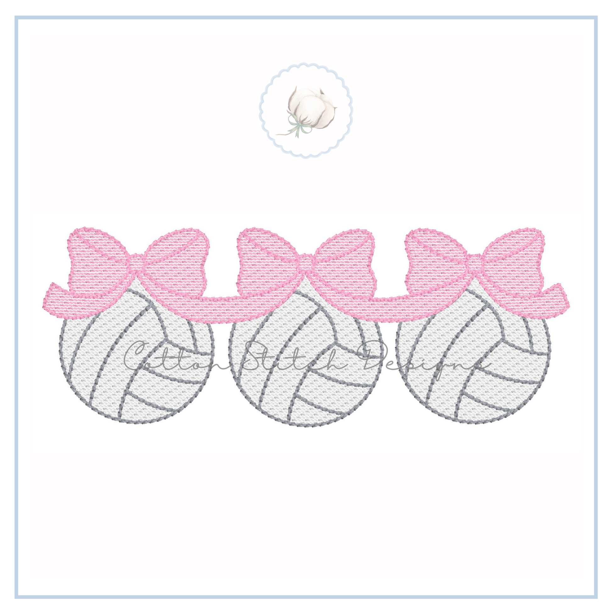 Volleyball Trio with Bows Design is a sketch stitch machine embroidery design, designed to have a lower stitch count and a lighter fill than a traditional fill stitch, allowing fabric to show through for a sketch appearance.